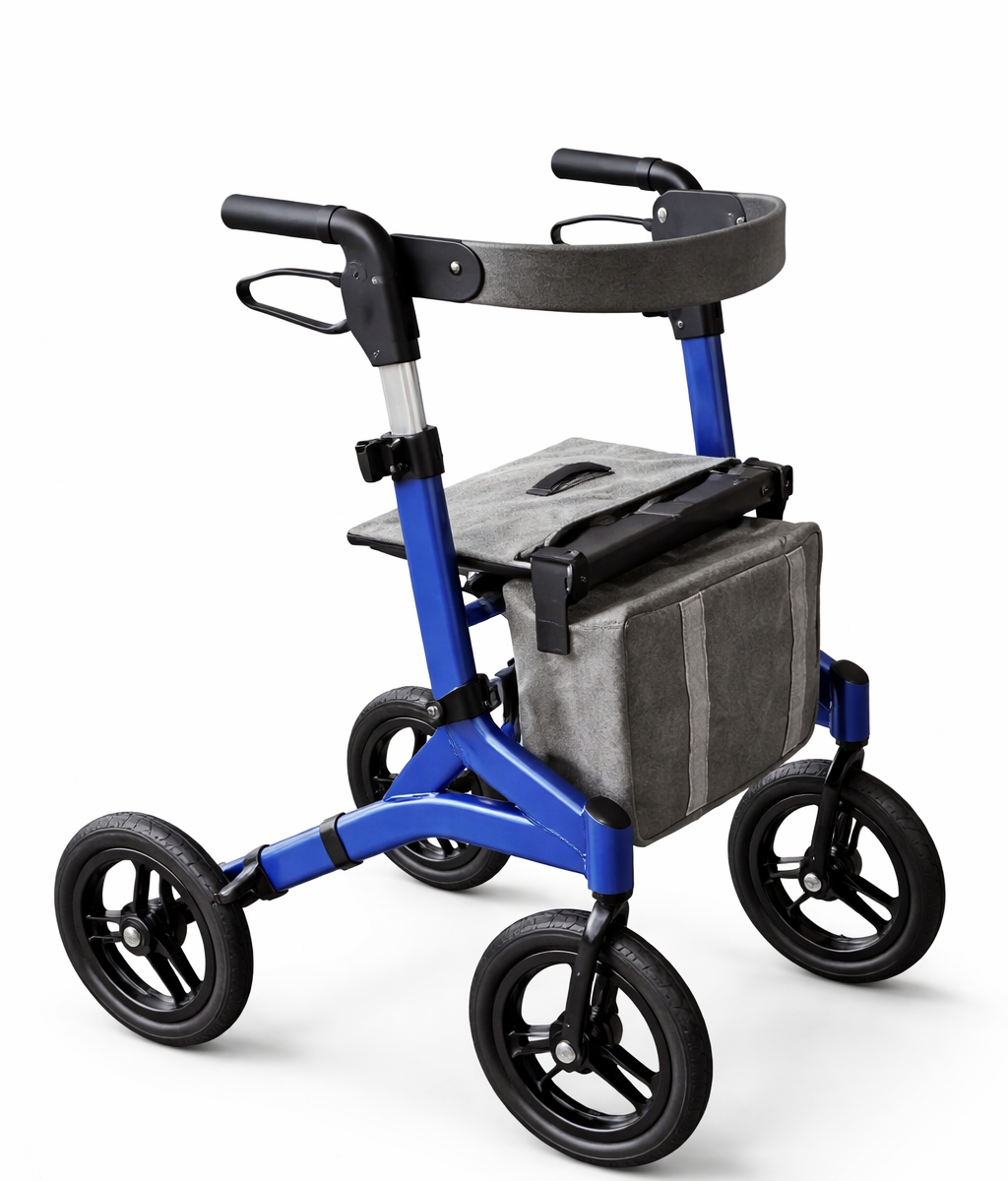 Dankzij de grote luchtbanden rondom, wordt elke wandeling een stuk aangenamer. De handgrepen zijn ergonomisch vormgegeven en verder wordt de rollator standaard geleverd met een rugsteun, stokhouder en een boodschappentas aan de voorzijde.