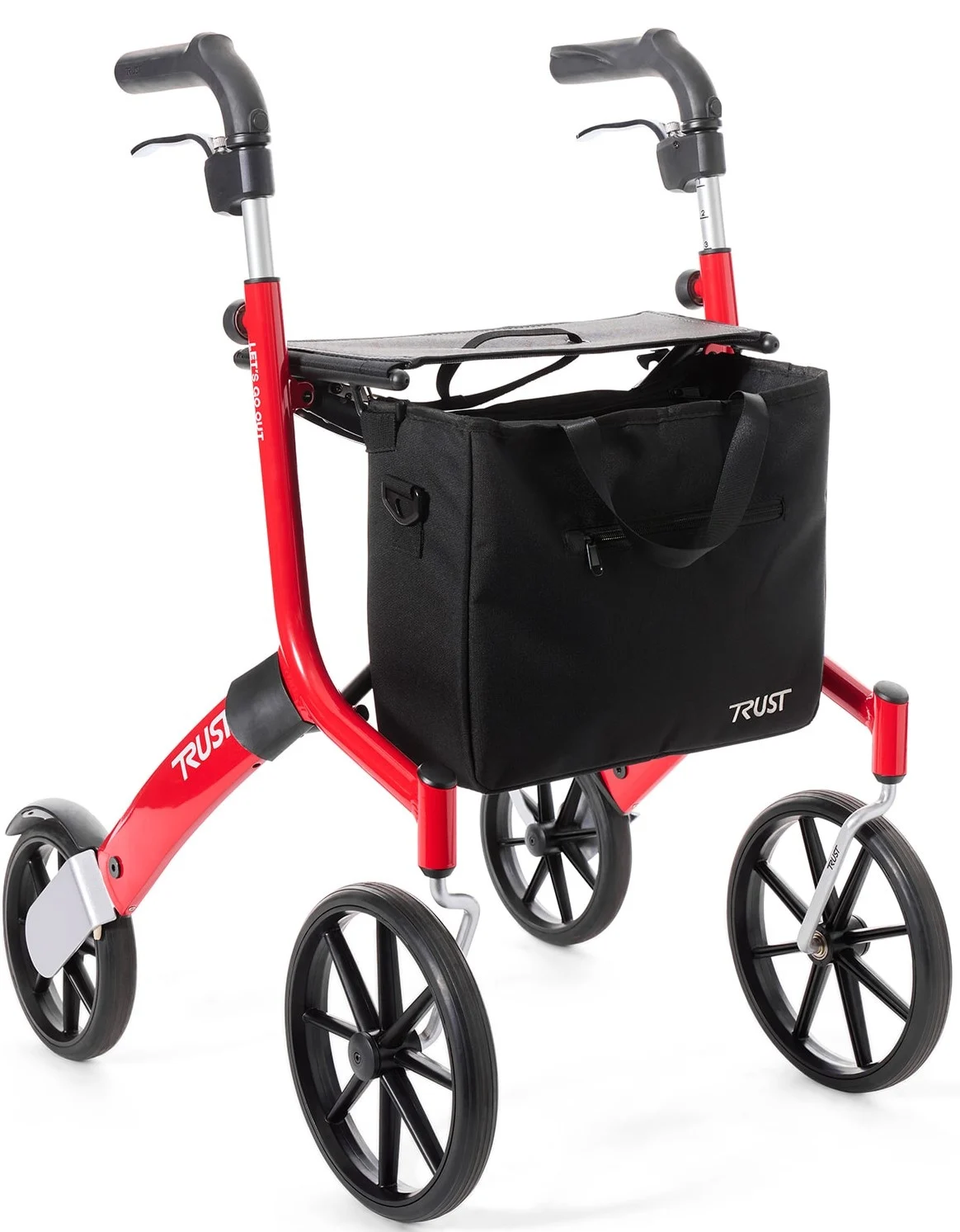 Trust Care Let's Go Out Rollator (6,1 kg): luxueus en duurzaam. Deze rollator van Trust Care is uniek in zijn soort. De Trust Care Let's Go Out Rollator heeft namelijk in tegenstelling tot andere rollatoren een schokabsorberend ophangsysteem voor de achterwielen. Hierdoor kunt u over vrijwel ieder terrein moeiteloos lopen met uw rollator.
